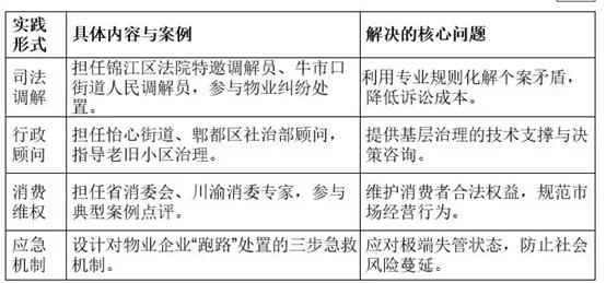实务实践者(底层):他拥有国家注册物业管理师资格,国企外部董事,具备深厚的市场实战经验。同时,作为法院特邀调解员、街道人民调解员和街道社区顾问,他在具体矛盾化解与企业治理中积累了大量一线案例。