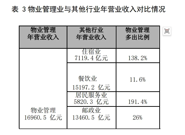 (二)在年营业收入方面。物业管理年营业收入 16960.5 亿元,较住宿业7119.4亿元,多出138.2%;较餐饮业 15197.2 亿元,多出 11.6%;较居民服务业 5820.3 亿元,多出 191.4%;较邮政业13460.5 亿元,多出26%(详见表3)。