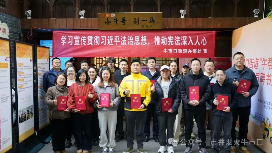 2025年12月4日,为进一步“学习宣传贯彻习近平法治思想,推动宪法深入人心”,以《中华人民共和国法治宣传教育法》正式施行为契机,以法律“七进”为抓手,牛市口街道在宏济新路265号小牛哥驿站开展法治系列主题宣传活动暨“金牌调解员”聘任仪式。四川天府社区建设研究中心主任、成都三泰联合物业管理师事务所主任、住房城乡建设厅物业专家伍三明,美团配送成都运营中心履约经理王柯皓等14位来自法律、物流等领域的专业人士,从锦江区司法局、牛市口街道办事处有关领导手中接过聘书,正式成为“牛帮帮”金牌调解员。