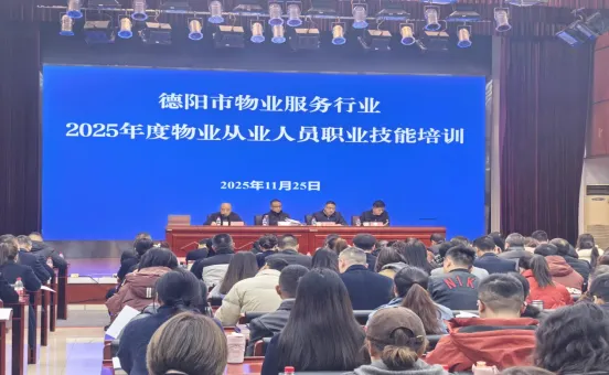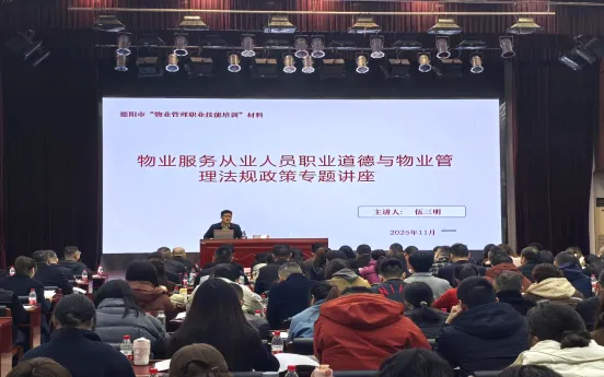 2025年11月25日-27日,市住建局精心组织、德阳市物业管理协会协办开展为期三天的全市物业服务行业职业技能培训大会。开班仪式由市住保中心主任李韵主持,市住建局副局长黄昌继、市纪委监委派驻市住建局纪检监察组组长刘霄出席并讲话。德阳经开区、各区(市、县)住建局、街道办事处(乡镇人民政府)物业管理相关负责人及业务骨干,以及物业企业管理人员等320余人参加培训,四川天府社区建设研究中心主任、成都三泰联合物业管理师事务所主任伍三明进行授课。