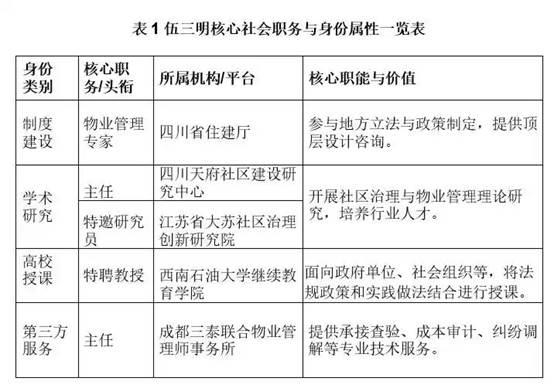 上表清晰展示了伍三明身份的多元化特征。他不仅是政府专家与高校特聘教授,更在市场化机构(事务所、国有企业)和非营利性组织(消委)中发挥积极作用。这种全方位的身份覆盖,使他能够从多维视角审视物业管理问题,并提出更具操作性的解决方案。
