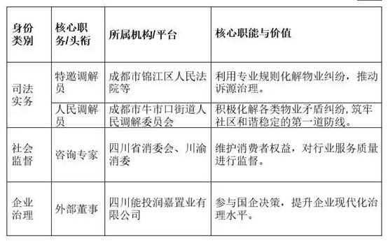 学术研究者(顶层):他不仅是四川天府社区建设研究中心研究员、江苏省大苏社区治理创新研究院特邀研究员,还主编了近80万字的著作《四川省物业管理条例注解与配套》,并发布了基于第四次全国经济普查数据的《全国城市物业管理统计数据研究报告》,确立了其在学术界的地位。
